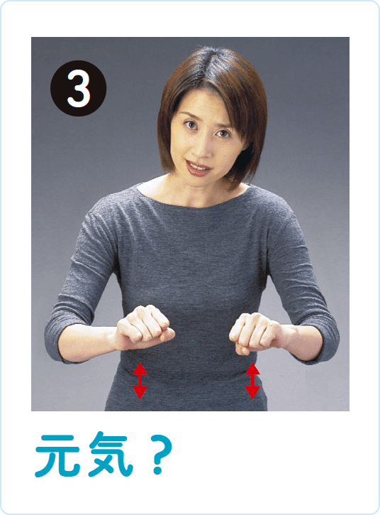 両手を握り、体の前に置き、2回上下させる(たずねる表情をする)。