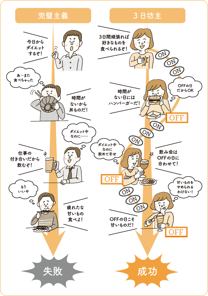 やり方は単純です。ダイエットする(ON)日を3日続けたら1日休む(OFF)、この3日坊主のサイクルを繰り返す。これなら、いけそうじゃないですか?実践のための基本的なルールは3つあります。