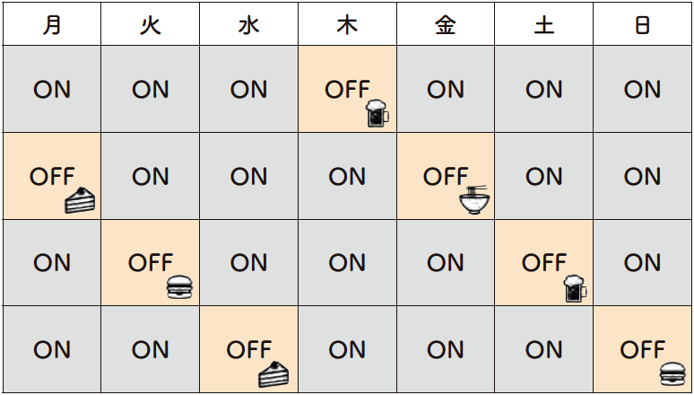 ②OFFの日は、1食好きなものを食べてよい。娯楽食でもOK。時間の制限もなし。
