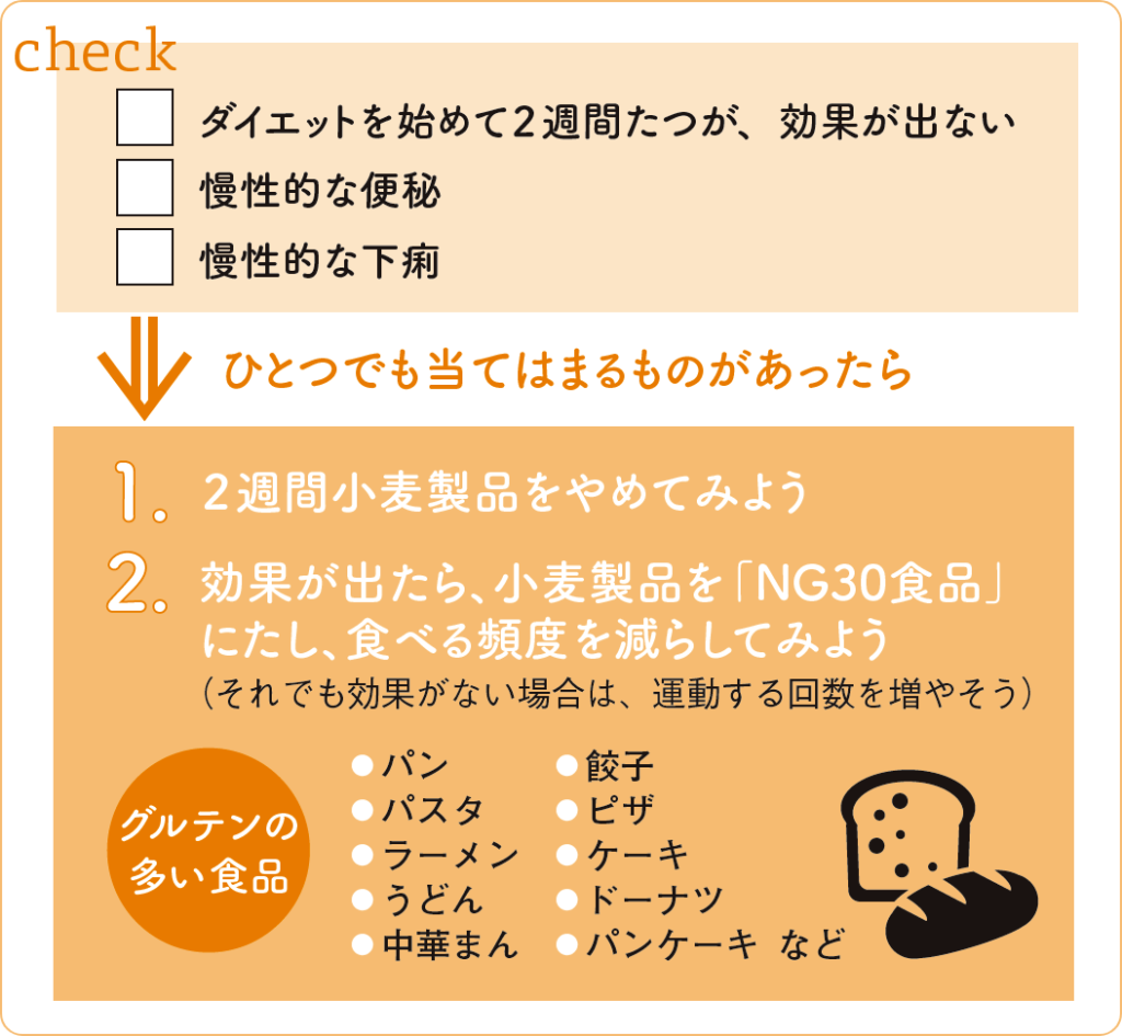 なかなか痩せられなかったり、慢性的な肌荒れ、便秘や下痢が多い場合は、一度グルテンの影響を考えて小麦製品を減らし、その後の変化を検証するのもよさそうです。