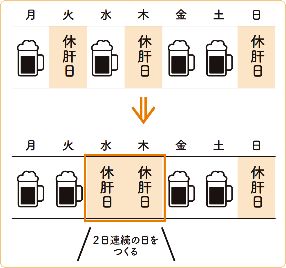そんなわけで休肝日は必ですが、日々の肝臓の頑張りを労って、ぜひ2連休をあげてください。