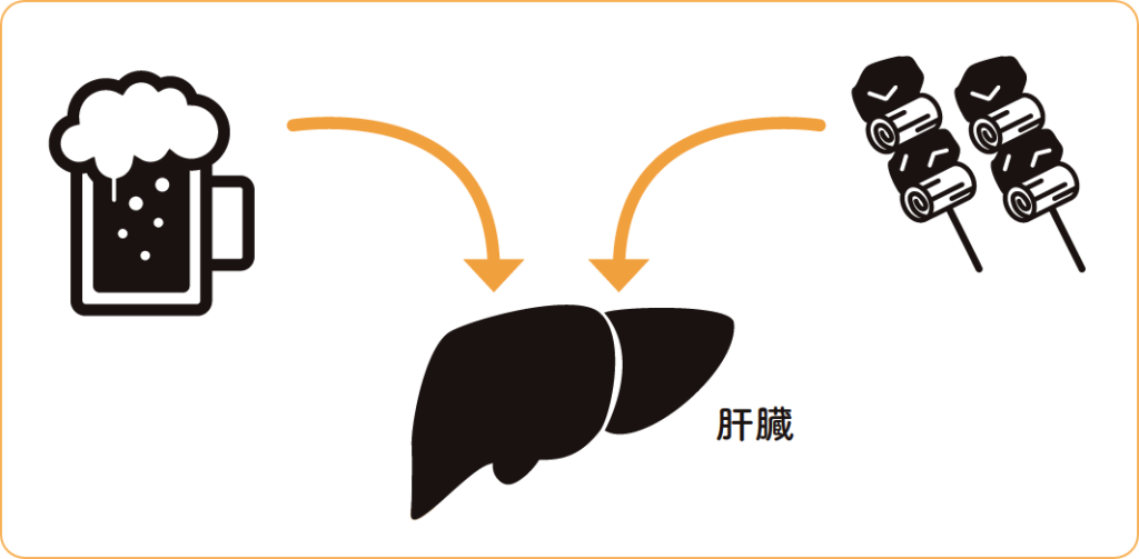 おつまみに含まれる栄養素は肝臓で代謝される。特に脂肪のもとになる糖質の代謝は、ダイエットのためには重要。お酒にも糖質が含まれるものが多いので、そのぶん肝臓の負担が増える。