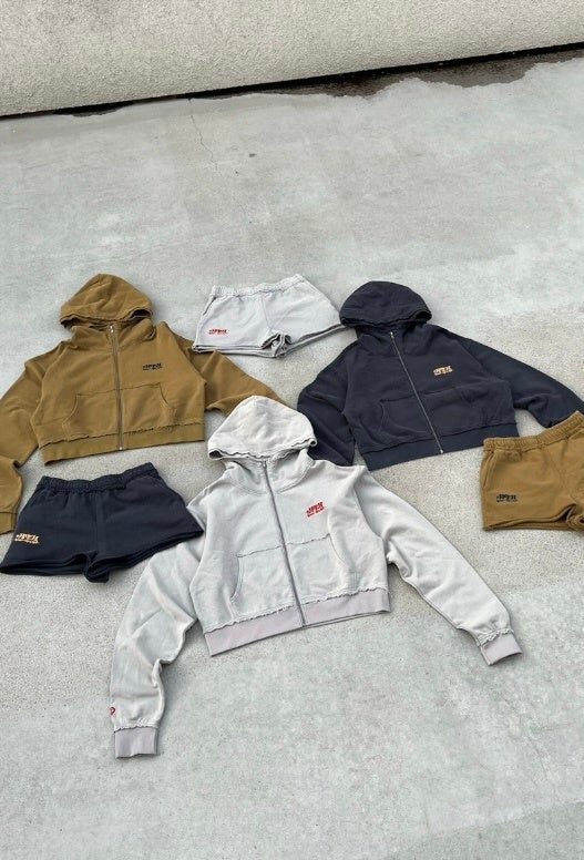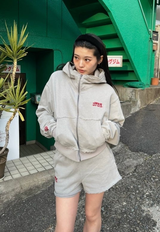 短丈のジップフーディーとショートパンツの上下セット売りで、着回し抜群アイテム。