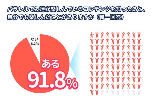 さらに「パラレルで友達が楽しんでいるコンテンツ(ゲーム、音楽、動画など)を知ったあと、そのコンテンツを自分自身でも楽しんだことがある」と回答したユーザーは約92%に達しました。