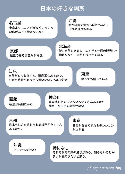 2位の「京都」に対しては、「日本らしさを感じられる場所がたくさんあるから」、3位の「沖縄」に対しては「日本の良さも海外の良さも感じられる」といったコメントが見られた。