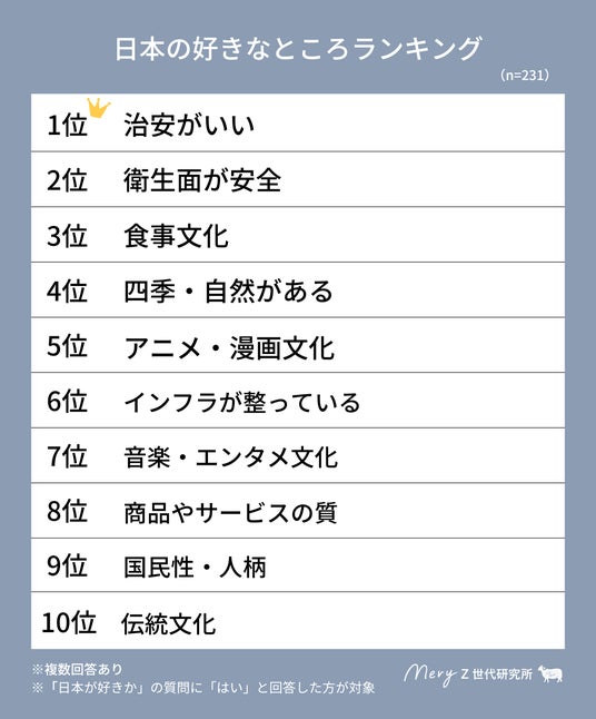 ■日本の好きなところ1位は「治安がいい」、2位は「衛生面が安全」3位は「食事文化」。 続いて、「日本の好きなところ」についてアンケートを実施。