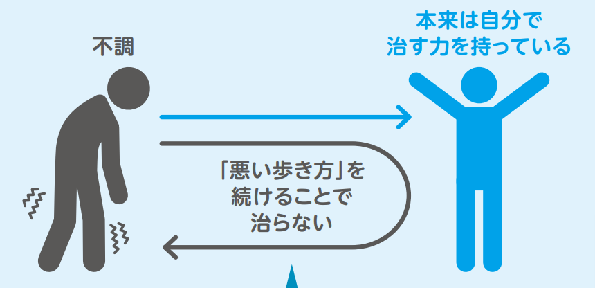 ケガがかさぶたになっていずれ治るように、人間は本来自分で不調を治す力を持っています。治らないのは、普段の「悪い歩き方」のせいなのです。