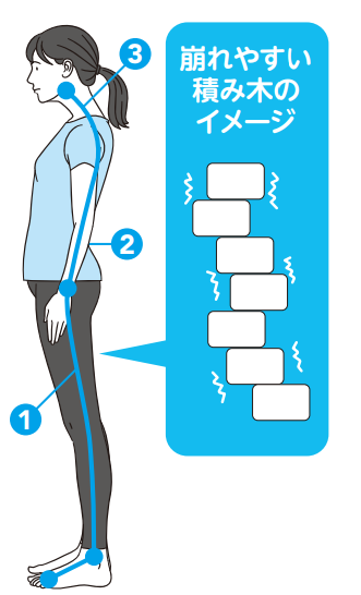 積み木をイメージしてみてください。S字状にバランスをとっている積み木の上部だけをまっすぐに整えたら、積み木は崩れてしまいます。人間も背中だけまっすぐに伸ばしても、うまく立っていることができません。まずは足元から正さなくては、猫背は治せないのです。