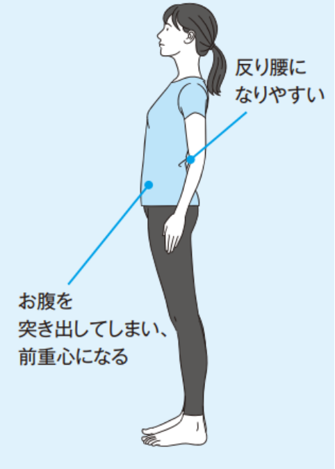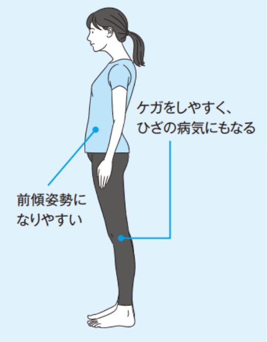 ひざもピンと伸ばしてしまうと靭帯や筋肉のバランスが崩れて逆側に反るようになります。すると、バランスをとるためにお腹が突き出てしまいます。人の足は動くためのものなので、ひざを伸ばし切るとロックがかかり動きにくくなるというデメリットも。