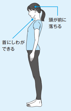 また、胸を張るのも、結局はお腹を突き出すような姿勢につながります。腰も反って、将来は腰や背中が歪んだ老人体型になりかねません。あごも引いてしまうと頭が前へ出て、体の重心が傾きます。おまけに首のしわまで増えるので、決してよいことはないのです。これらの間違えた姿勢が肩こりや腰痛、ひざの病気などに発展し、さまざまな不調を招くことになるのです。