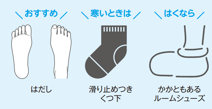 家ではスリッパをはかず、「はだし」がおすすめ。くつ下ははいてもOKですが、なるべく素足に近い状態ですごしてください。