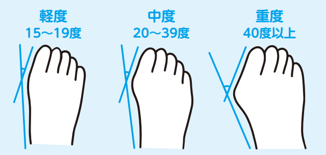 実際、外反母趾は一見してもわからない場合が多いのです。試しに、下図の方法で足の親指の角度をはかってみてください。たった15度内側に傾いているだけで、軽度の外反母趾です。まだ痛みはなくても、ほうっておくと角度が大きくなり、次第に歩くのが苦痛になっていきます。