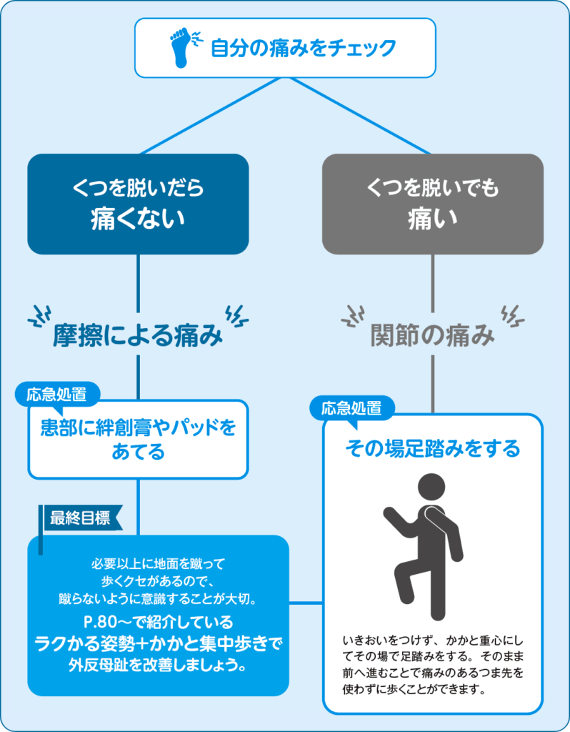 関節の痛みの場合は、歩く前にその場で足踏みすること。そして、そのまま動きを止めず、前へ歩き出してみてください。外反母趾の人はつま先で地面を強く蹴って進むクセがあり、それが関節の負担になります。その場で足踏みすることで蹴らずに足を動かす動作を体で覚え、その感覚のまま歩き出すことができるのです。とはいえ、どちらも応急処置なので一時しのぎ。最終的には、歩き方を改善しないと外反母趾は完治しません。