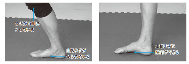❷かかと&外側重心にし、ひざの位置をつま先と揃えましょう。これだけで、扁平足が改善されるはずです。