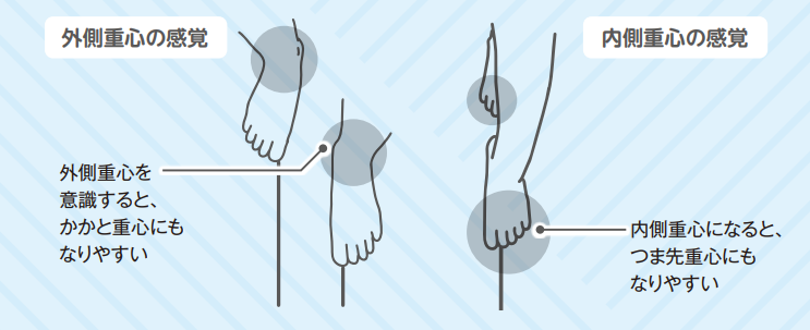 自然な歩き方は外側重心。一本線上を歩いていると、本来の歩き方が崩れてしまいます。