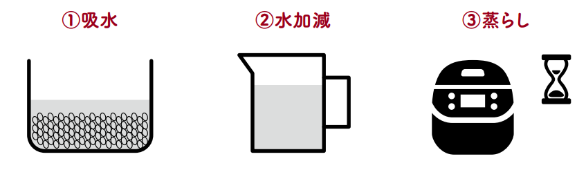 ① 吸水:炊飯前に、米にしっかり水を吸わせると、ふっくら仕上がる。