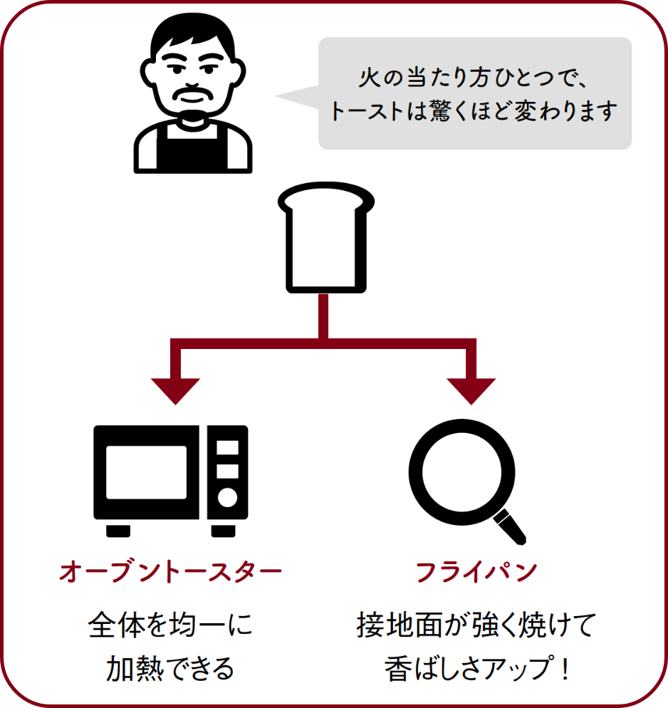 オーブントースターは庫内で均一に熱が回るのに対し、フライパンは底面に直接火が伝わるため、香ばしい焼き目がつく。トーストのおいしさは、火との接地面で大きく変わる。
