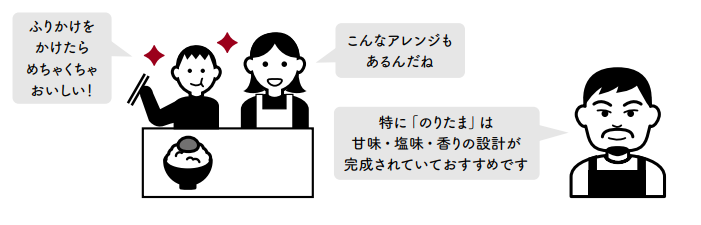 中でもおすすめなのが、ふりかけを組み合わせる方法です。たとえば定番の「のりたま」は甘味・塩味・香りのバランスが絶妙で、卵、魚、海苔がそれぞれ役割を担い、 ご飯を一気にごちそう”へと変えてくれます。