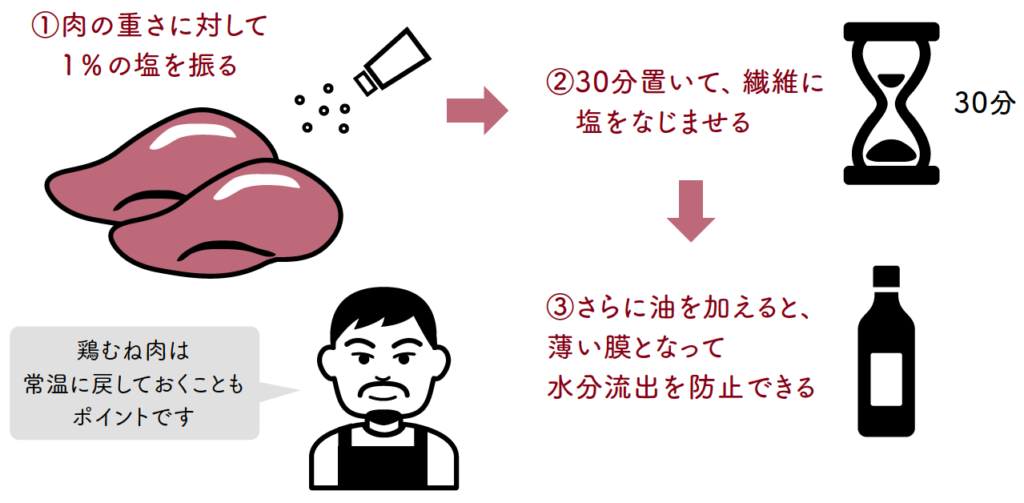 鶏むね肉に塩をまぶしてなじませると、水分が保持される。また、油を合わせれば、それがコーティングの役割を果たして、加熱中も水分の流出を防げる。