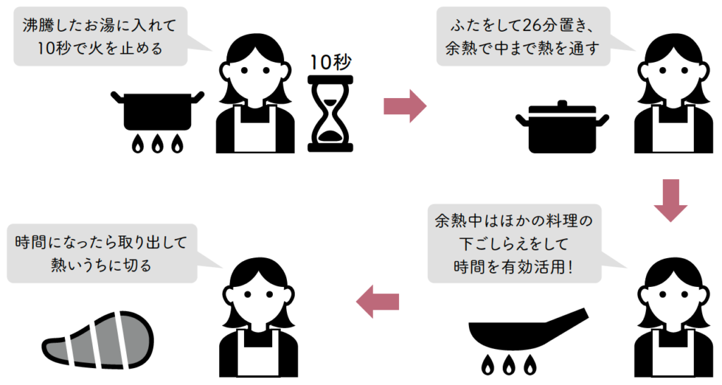 そして加熱の際は、余熱を生かすのが肝心。沸騰したお湯に鶏むね肉を沈め、10秒で火を止めてふたをし、そのまま25分置きましょう。この間にほかの料理の下ごしらえを進めておくと効率的です。鍋は80〜90°C前後を保ち、余熱でじっくり火を入れることで、肉をやわらかく仕上げることが可能です。