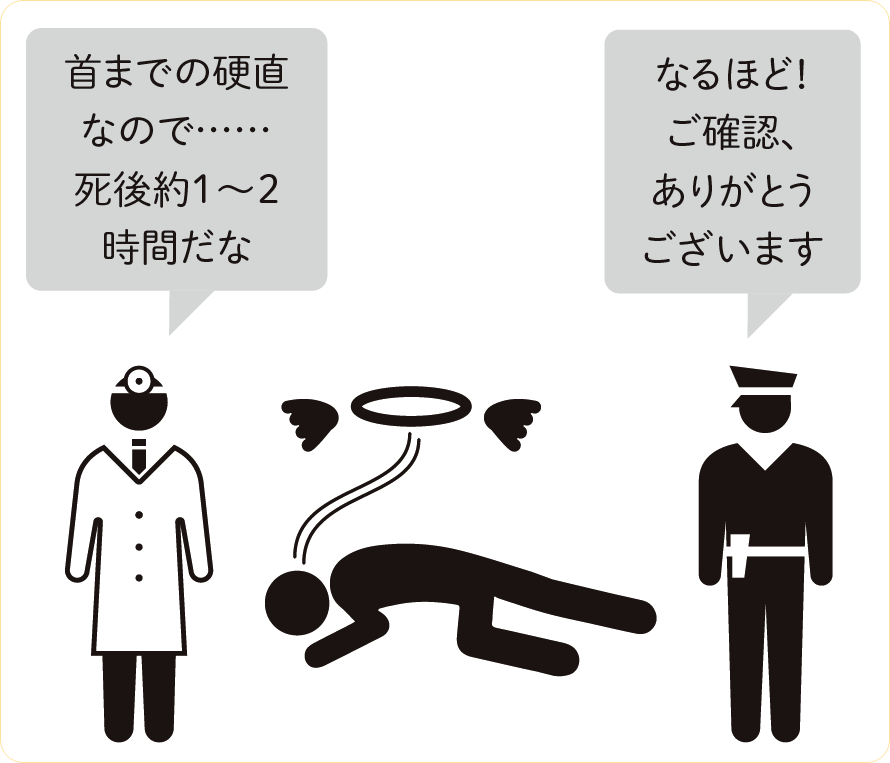死後硬直はまずあごや首からはじまり、上半身、下半身へと広がる。1日を過ぎるころには少しずつゆるむ。この時間経過による変化が死亡推定時刻の判断材料となる。