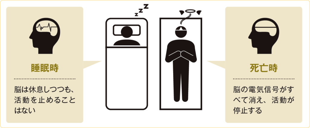眠っているときは脳が活動を続けている一方で、死に至るとすべての電気信号が消え、活動の再開は起こらない。