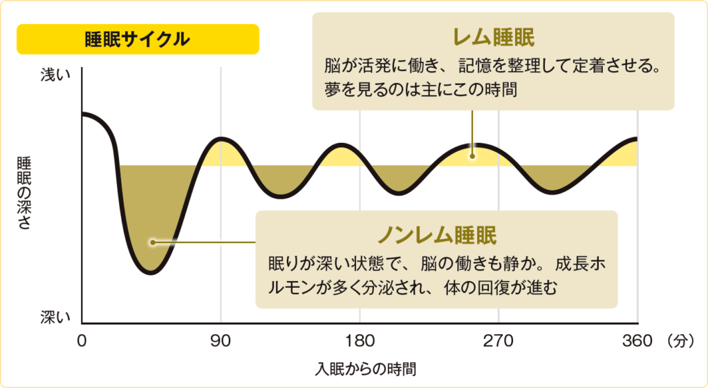 - 【ノンレム睡眠】眠りが深い状態で、脳の働きも静か。成長ホルモンが多く分泌され、体の回復が進む