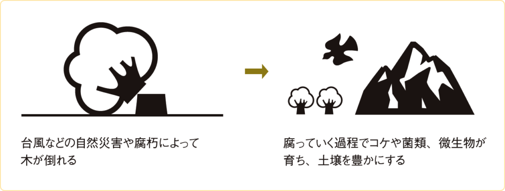生物の腐敗と同様に、木の腐敗も命の循環を支えている。倒木は、腐敗の過程で多くの生き物のすみか・食糧となり、新たな木も芽生えて森が再生していく。