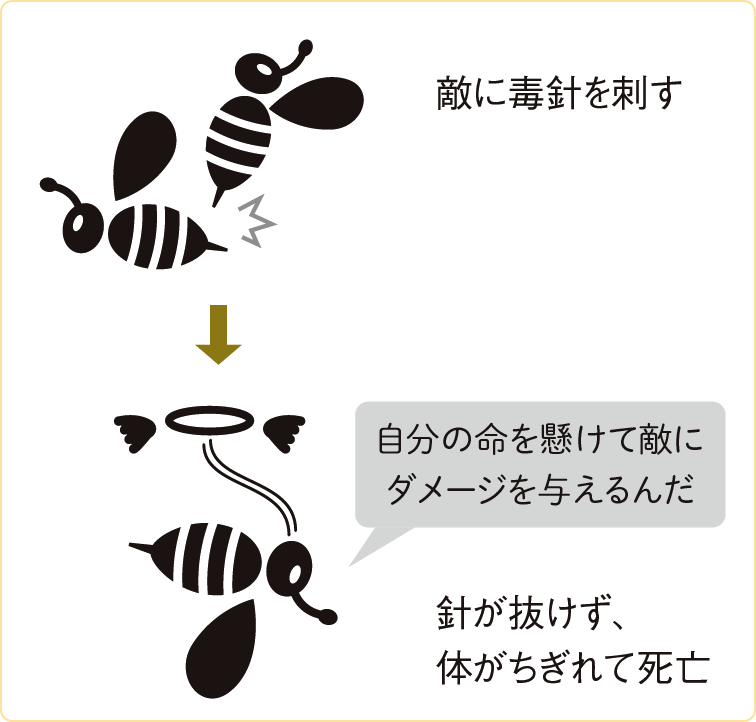 自然界には、自らの命を代償にして仲間を守る生き物がいます。たとえば、ハチやアリのような社会性昆虫はその代表です。メスのミツバチ(働きバチ)は巣を守るために敵に毒針を刺しますが、針の先に連動して内臓が引き抜かれ、命を落としてしまいます。それでも、群れを守るために戦うのです。
