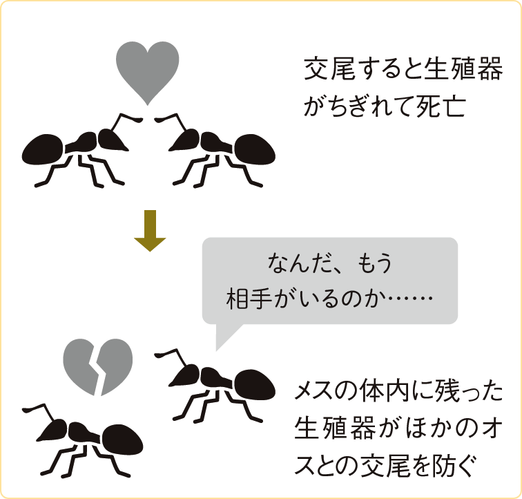 また、オスのアブやアリは、交尾の際に生殖器が体からちぎれて死に至ります。これは、メスの体内に自身の一部をとどめておくことで、ほかのオスとの交尾を防ぐためです。命をかけて子孫を確実に残す――それが彼らの進化した戦略といえます。役割を全うした個体の死は、次の世代をつくるための必然的な段階として組み込まれているのです。