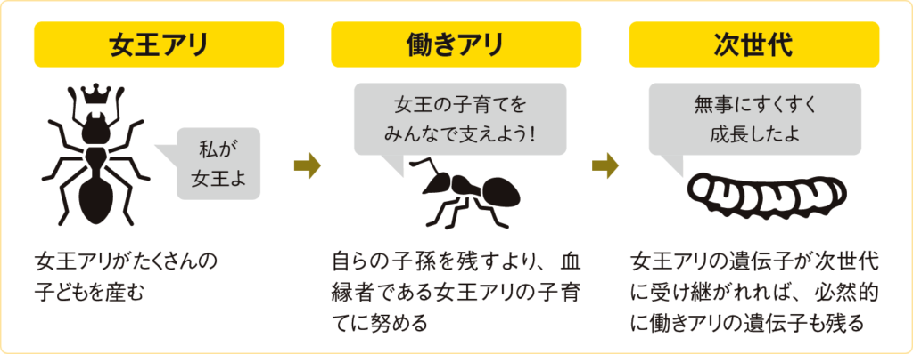 自分と血のつながりが強い女王アリを支え、その子孫を増やしていけば「自分の遺伝子」は残り、つまりは利益となる。利他的な行動は生存戦略のひとつといえる。