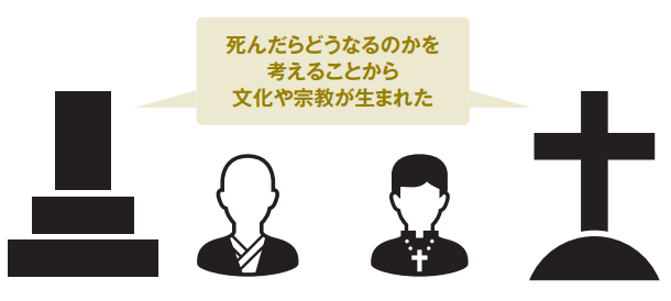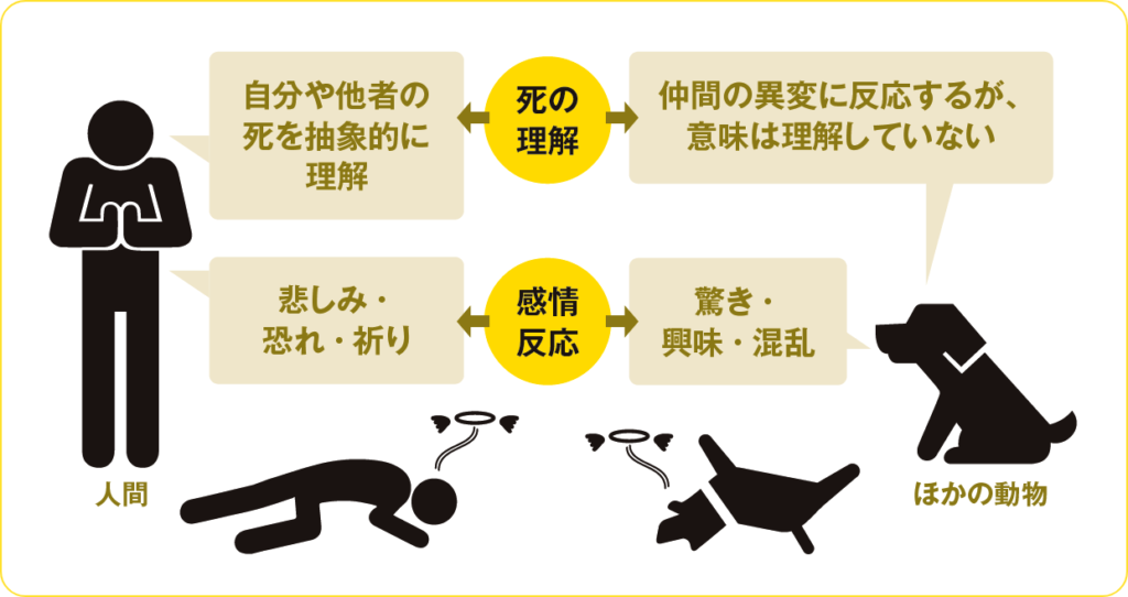死を意識することから弔いが生まれ、やがて文化や宗教が形成された。死の自覚は、人間だけの知的進化の証といえる。