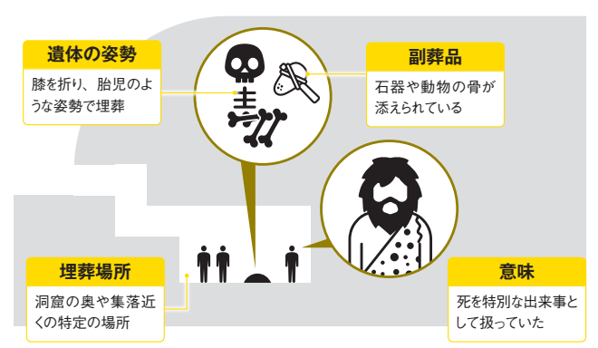 ネアンデルタール人は、遺体を特定の場所に埋め、副葬品を添えていた。単なる死体の処理ではなく、意図的に故人を弔っていたといえる。