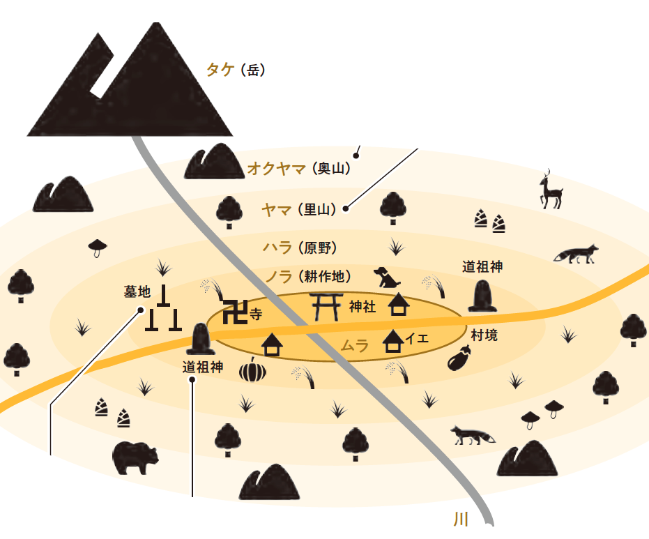 ヤマのさらに先にあるオクヤマ(奥山)は、猟師や炭焼きなど山で活動する人びとを除くと、基本的に人が立ち入ることはなく、動物や精霊、カミの領域とされます。さらに険しい山を指すタケ(岳)になると、人間は修験者(山伏)くらいしか入れません。