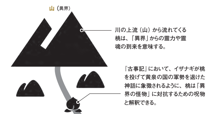 川の上流(山)から流れてくる桃は、「異界」からの霊力や霊魂の到来を意味する。