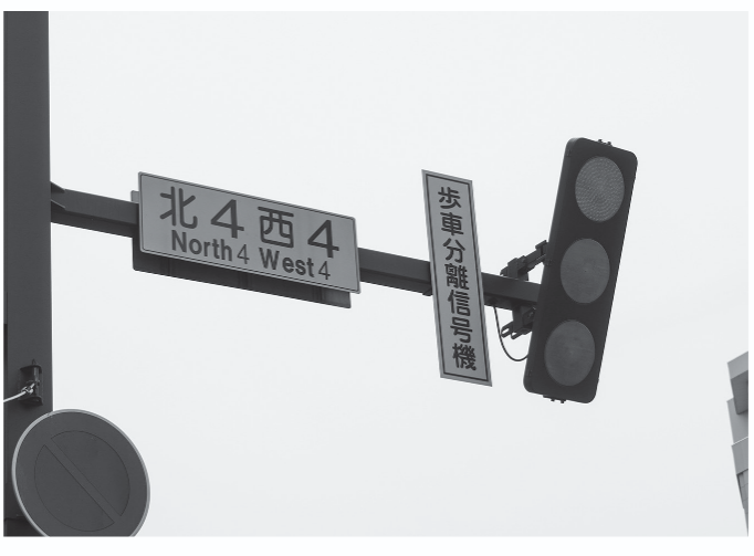 そのため、札幌の交差点には「渋谷駅前交差点」「梅田新道交差点」といった、本州では当たり前の「交差点名」がない場合が多く、信号も条丁目に基づいて「北4西4」といった表記がされています。また、交差点は4つの区画が交わる場所のため、同じ交差点でも各区画の角に立つそれぞれの信号が「北4西4」「北3西4」「北3西3」「北4西3」と、すべて異なる場合もあります。