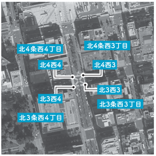 下の空撮写真は札幌駅近くの交差点。同じ交差点内に、4つの名称の異なる信号が立っています。なお、平成28年(2016)に「南4西3」「南4西4」の交差点が「すすきの」交差点へと名称変更され話題となりました。