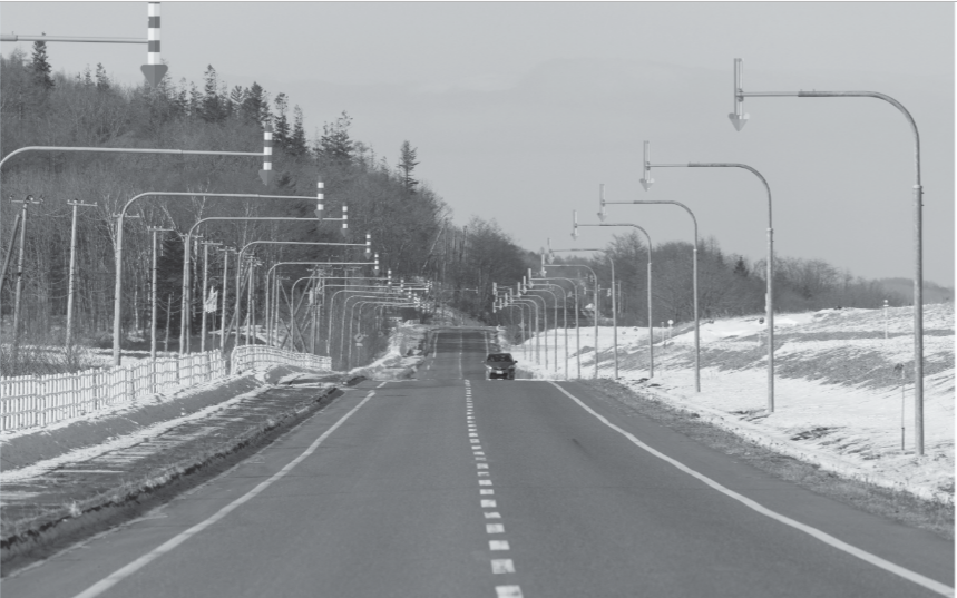 北海道の道路を車で走っていると、ポールの先に矢印の形をした標識をよく見かけます。この「矢印」は、通称「矢羽根付きポール」と呼ばれるもの。積雪で道路の境界が見えなくなった時に車道と路肩の境目を示すほか、視界が悪い時にドライバーの視線を誘導する役割を果たしています。
