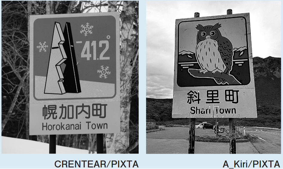 近年、北海道以外の地域でもイラストを用いたカントリーサインを採用する自治体が増えつつありますが、北海道では他地域に先駆けて平成2年(1990)から整備を行っており、現在は道内に179あるすべての市町村で、各地域の名所や特産品などのイラストと市町村名を合わせたカントリーサインを設置しています。