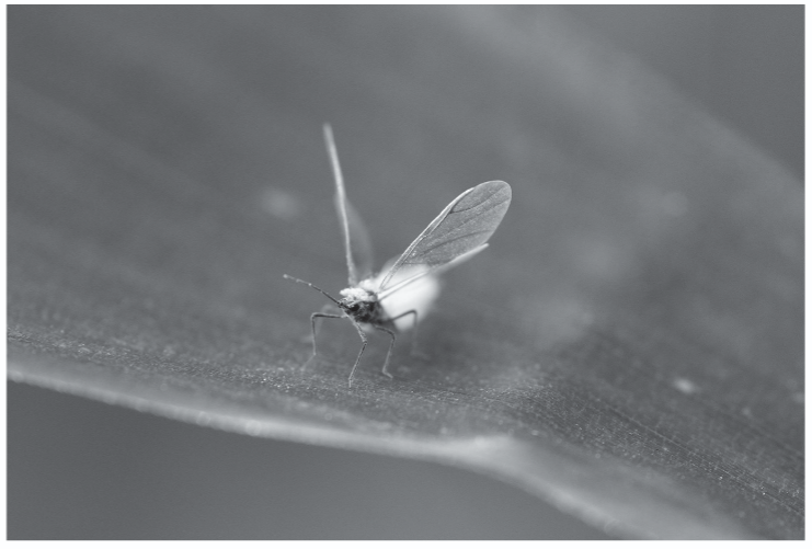 「雪虫」ことトドノネオオワタムシの成虫。北海道や東北地方で、晩秋から初冬にかけて白い綿毛のようなものをまとって雪のように飛ぶ。
