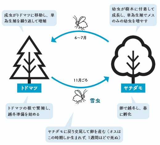 雪虫の正体は「トドノネオオワタムシ」というアブラムシの一種。春から秋にトドマツの根などで単為生殖を繰り返して増殖し、秋になると羽を持った成虫が産卵のためヤチダモへ移動します。