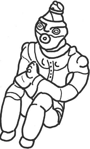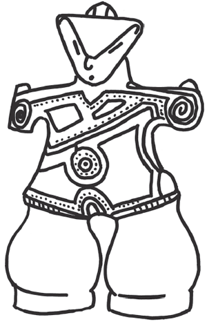 逆三角形の顔と異常に太い両脚が特徴。顔には眉毛、目、鼻、口を表す穴が開けられていることで仮面と見られる。胴体には非対称の渦巻き模様が施され、内部は空洞の中空土偶。この土偶にも粘土に雲母片が塗り込まれている。