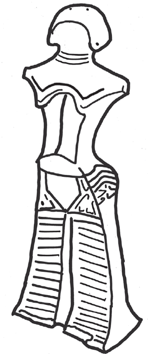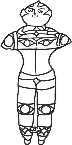 両腕が消失し不明となっている。両脚には左右対称の幾何学模様。脚先は丸いために立脚不可能。祭祀や呪術用の土偶との解釈がある。