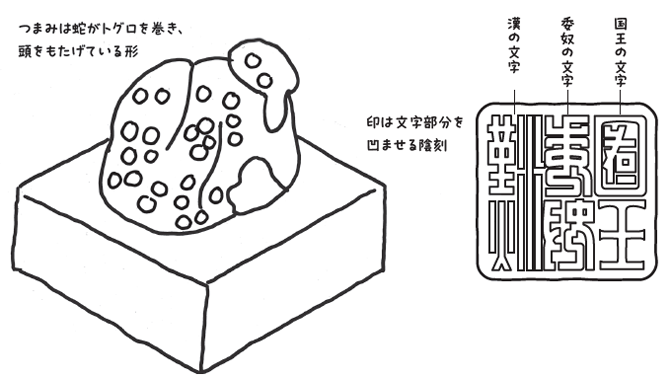 金印のつまみは蛇が頭をもたげて振り返る形になっている。これは東夷と呼ばれた当時の日本民族が南方系蛇族だったことを示唆している。古代神話に大蛇、龍神伝説が多い事実と合致する。