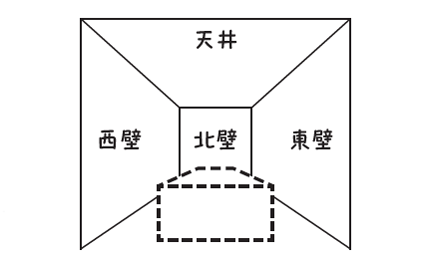 高松塚古墳石室。古墳は二段式円墳で上段直径18m、下段直径23m、高さ約5m。石室には棺や副葬品を入れる石棺式石室があり、長さ約2.6m、幅約1m、高さ約1.1mで、壁画が描かれている。石室内からは副葬品の大刀の金具、海獣葡萄鏡、ガラス製と琥珀製の玉類のほか、棺に使われた金銅製装飾金具などが出土