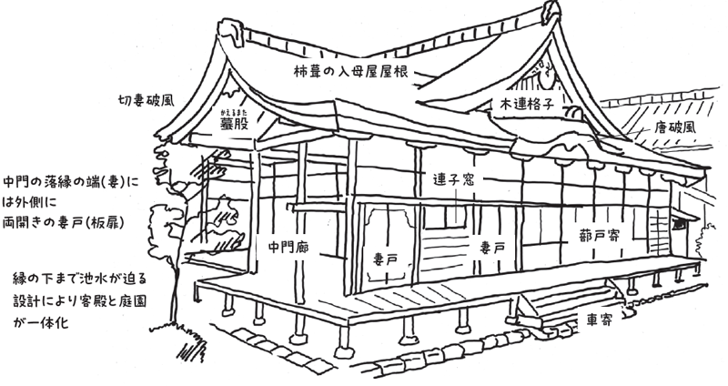 ※寝殿造=平安時代に成立した建築様式。貴族の生活領域となる寝殿を中心に渡り廊下でつないだ対屋が囲むように建てられるのが特徴。その間に池や築山の庭がつくられた。