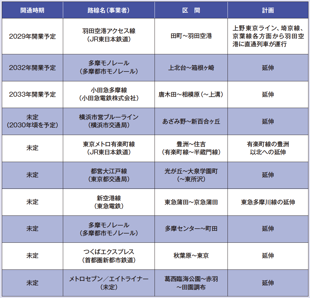 例えば記憶に新しい代表例としては、東京メトロ南北線開通で利便性がアップした溜池山王、白金高輪、麻布十番、王子。また、都営大江戸線開通もきっかけで人気エリアとなった勝どき、光が丘などが挙げられるでしょう。図に首都圏の新線開通情報をまとめてみました。