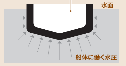船を押し上げる浮力は、物体が押しのけた水の重さと同じ大きさになります。水面下の船体が大きいほど押しのける水が増え、その分だけ浮力も大きくなるのです。重い船体が浮いていられるのは、この浮力と自重(重力)がつり合うよう形状が工夫されているためといえます。