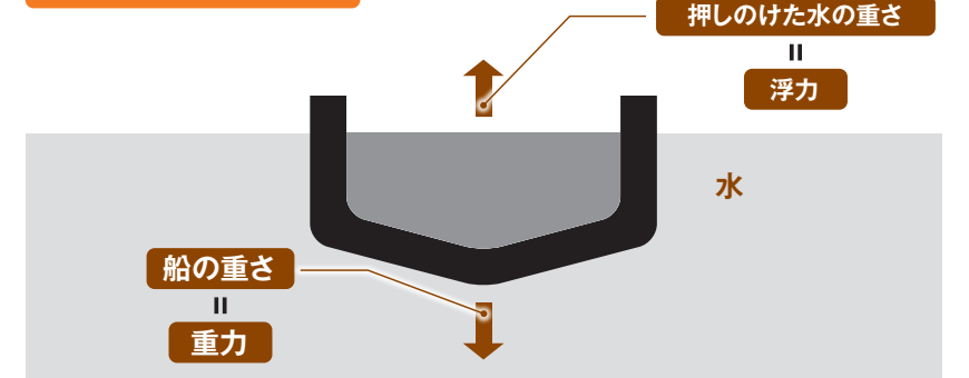 船が押しのけた水の重さと同じだけ、水が船を水面上に支える浮力が働きます。この浮力と船の重さ(重力)がつり合えば、鉄の船でも海の上に浮き続けることが可能です。