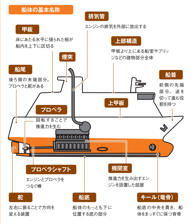 船首は進む際の抵抗が小さくなる形に設計され、船尾には舵やプロペラなどがつきます。